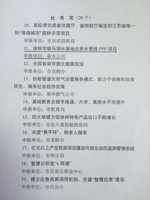 2016年,我公司积极探索创新发展的方法和路径,投资建设的骆马湖水源地及原水管线PPP项目荣获2016年度“徐州市创新奖”政府系统优秀奖。